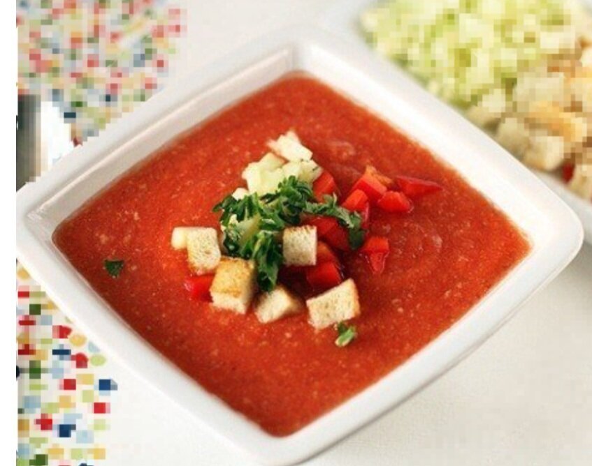 Ингредиенты 🍅Помидор 1500 г 🌶Перец болгарский красный 2 шт 🧅Лук 100 г 🧄Чеснок 3 зубчика 🧂Соль 1/2 ч.л 🍶Масло оливковое 50 мл 🥖Хлеб белый 150 г 🥒Огурец 200 г 🍅Помидоры слегка надрезаем накрест и на пару минут опускаем в кипящую воду. После этого легко очищаем кожицу и вырезаем серединку. Далее с помощью блендера измельчаем до однородной массы🍅 помидоры, один сладкий🌶 перец и 🧅луковицу. При помощи ступки или чеснокодавилки измельчаем🧄 чеснок, добавляем к нему🧂 соль, 🍶оливковое масло и 🥖хлебный мякиш (50 г). Тщательно все перемешиваем, если будет суховато – можем долить немного кипяченой воды. Добавляем хлебную смесь в🍅 томатное пюре и хорошо перемешиваем. Если суп слишком густой – немного разбавляем его водой. Убираем в❄️ холодильник на несколько⏰️ часов, до полного охлаждения. Оставшийся 🥖хлеб нарезаем небольшими кубиками и подсушиваем на сухой горячей сковороде или в ♨️духовке, чтобы получились сухарики. Такими-же кубиками нарезаем оставшийся перец и очищенные от кож