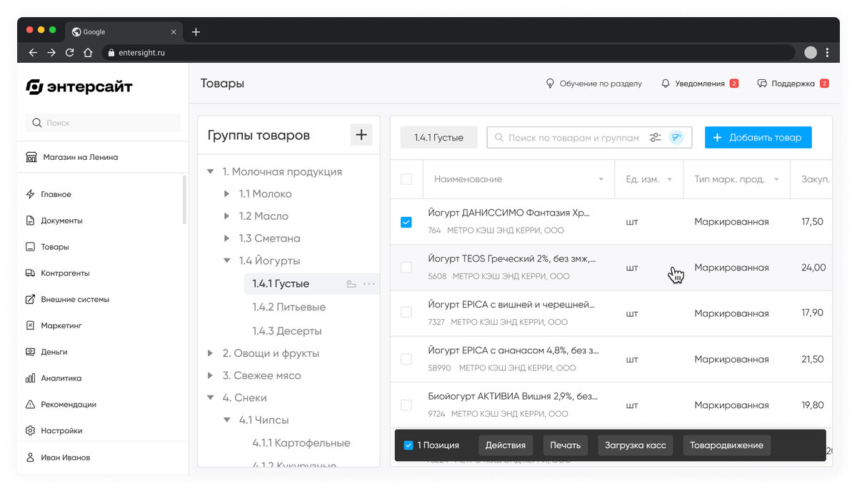 Энтерсайт — товароучётная система для продуктовых магазинов, которая позволяет сократить расходы магазина на сотрудников и повысить доход за счет оптимальной технологии торговли, а также контролировать процесс движения товара от начала до конца. Попробуйте бесплатно 14 дней!