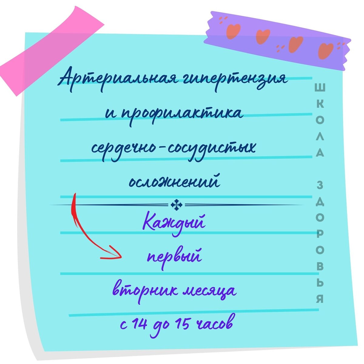 Напоминаем, что каждый первый вторник месяца проводится Школа здоровья для пациентов на тему "Артериальная гипертензия и профилактика сердечно-сосудистых осложнений". Ждём всех слушателей 1 августа 2023 в 14:00!