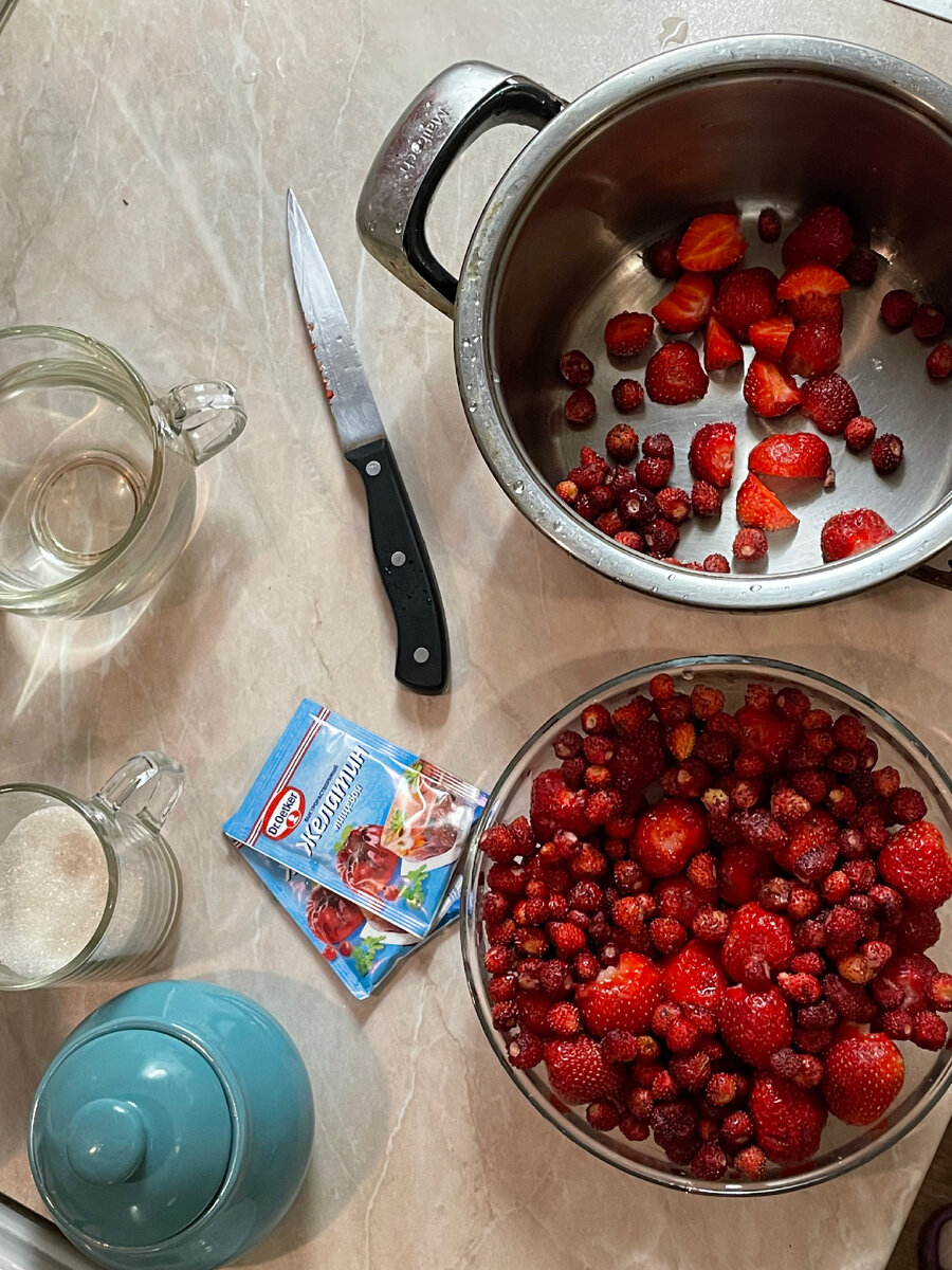Для того, чтобы сделать вкусное, летнее, клубничное муссовое желе нам понадобятся следующие ингредиенты: - клубника 600 гр - желатин – 20 гр - сахар 115 гр - вода – 300 мл Для начала промойте клубнику, удалите хвостики, разрежьте клубничину на две-три части. Я делала с добавлением земляники. 1. Поместите ягоды в кастрюлю. 2. Добавьте сахар 3. Добавьте 100 мл воды. 4. Поставьте кастрюлю на огонь, доведите до кипения и проварите 2-3 минуты, периодически помешивая. 5. Подготовьте желатин. Готовьте его согласно инструкции. У меня был желатин марки Dr.Oetker, 20 гр желатина всыпала в 200 мл горячей воды, дала набухнуть в течении 5 мин. 6. Добавьте желатин в кастрюлю с проваренной клубникой. 7. Возьмите погружной блендер и пропюрируйте ягоды. Чем дольше работаете блендером, тем воздушнее получается масса. 8. Разливаете получившуюся смесь по формам 9. Дайте немного остыть и отправьте в холодильник до полного застывания. я оставила на ночь. Все готово, наслаждайтесь вкусным клубничны