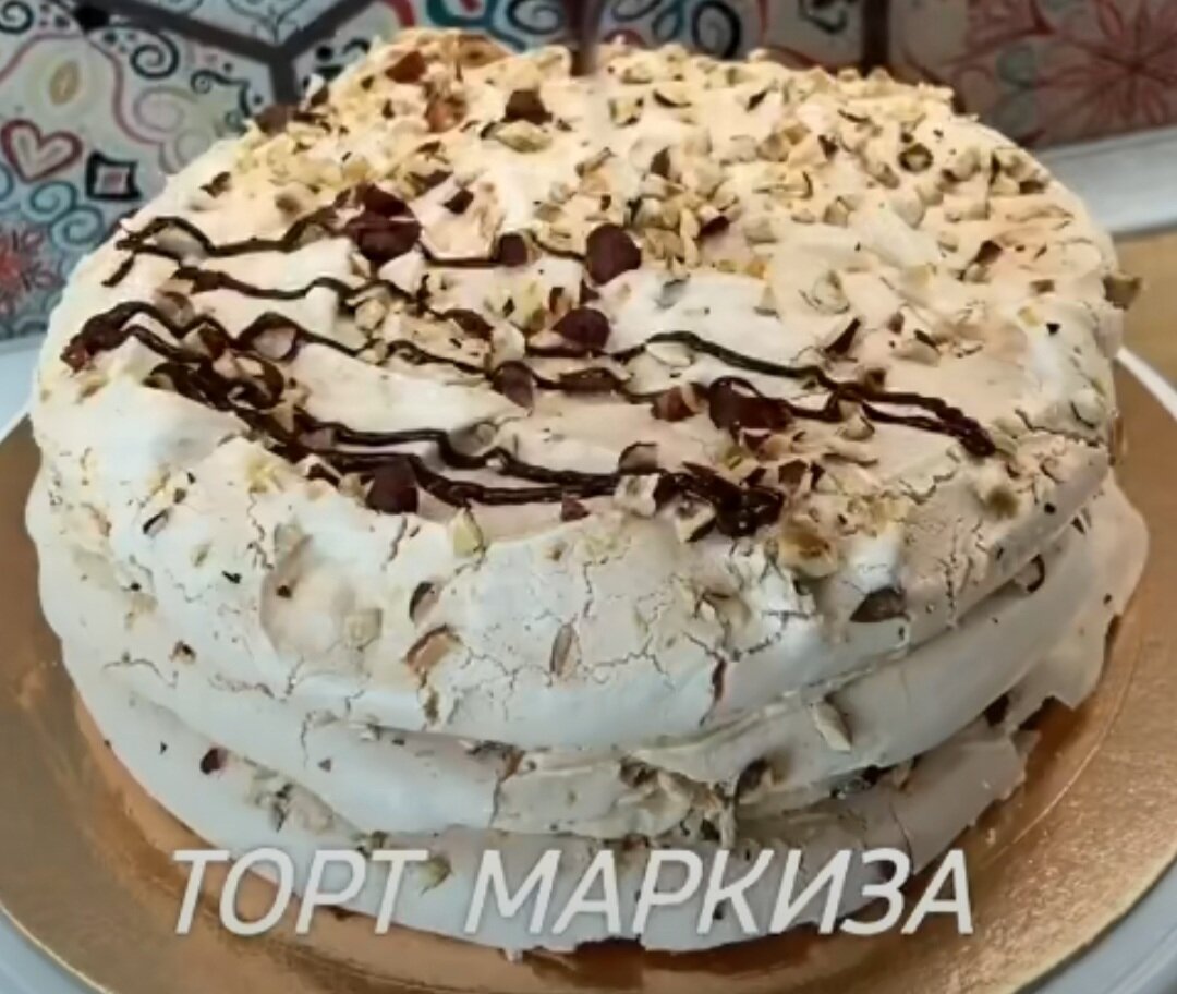 ТОРТ «МАРКИЗА». Выглядит просто потрясно.🎂 Сохраняйте, делитесь с друзьями, торт точно заслуживает внимания! ✅Ингредиенты: 🔺280-300г муки (всю сразу не добавляем) 🔺180 г сливочного масла 🔺4 желтка 🔺1 л сахара 🔺1 ч.л. соды без верха 🔺1 ч.л. уксуса ❇️Приготовление: Холодное масло натереть в муку, перетереть в крошку, добавить желтки, соду, погашенную уксусом, сахар, замесить тесто. Разделить на 3 равные части, убрать в холодильник. ✅Ингредиенты для безе: 🔺4 белка 🔺щепотка соли 🔺1 ч.л. лимонного сока 🔺1 ст. сахара 🔺орехи 80 г ❇️Приготовление: Белки начинаем взбивать на медленных оборотах, в легкую пену добавляем соль и лимонный сок, продолжаем взбивать, порционно добавляем стакан сахара. Взбиваем до устойчивых пиков. Тесто распределяем по намеченной форме, выкладываем безе. Посыпаем измельченными орехами, у меня фундук. Выпекаем при 160 градусах около 50 минут. ✅Крем: 🔺варенная сгущенка 300 г 🔺сливочное масло 150 г ❇️Приготовление: Масло взбиваем до пышности, по ложке