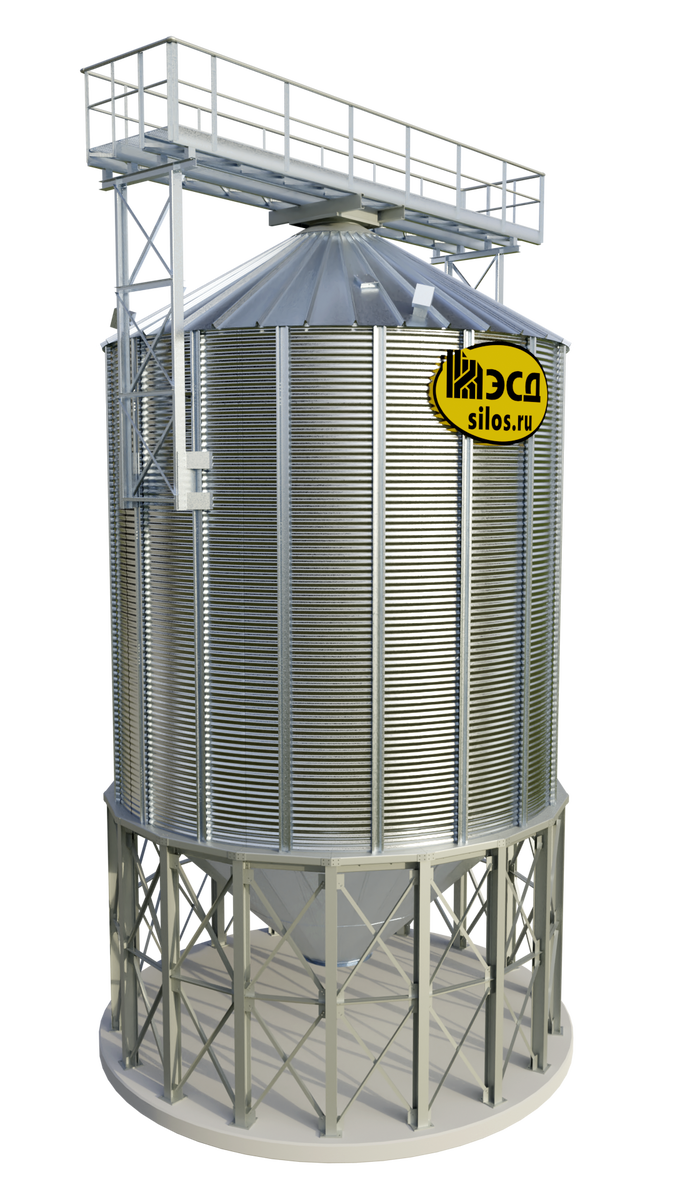 Силосы могут быть выполнены различных диаметров и высот. Цилиндрические металлические силосы предназначены для хранения зерна (пшеница, кукуруза, ячмень, рис и т.д.), масличных культур (подсолнечник, соя), а также для гранулированной продукции и мучнистого сырья. Крыши силосов выполнены с углом наклона 30 градусов, что обеспечивает оптимальные прочностные характеристики и соответствует СНиП 2.10.05-85. Крыша состоит из из каркаса и панелей кровли. Каркас кровли разработан с учетом поддержки не только собственного веса крыши, но и нагрузки транспортного оборудования, галерей, дополнительной нагрузки снега. Состоит из балок и перемычек выполненных из оцинкованного металлопроката с толщиной цинкового покрытия до 450 г/кв.м. и классом прочности 350, что обеспечивает особую прочность конструкции. Панели кровли силоса имеют по два ребра жесткости трапециевидного сечения. В зависимости от диаметра силоса конструкция кровли может быть одно и двух ярусная. Цилиндрическая часть силоса состоит из