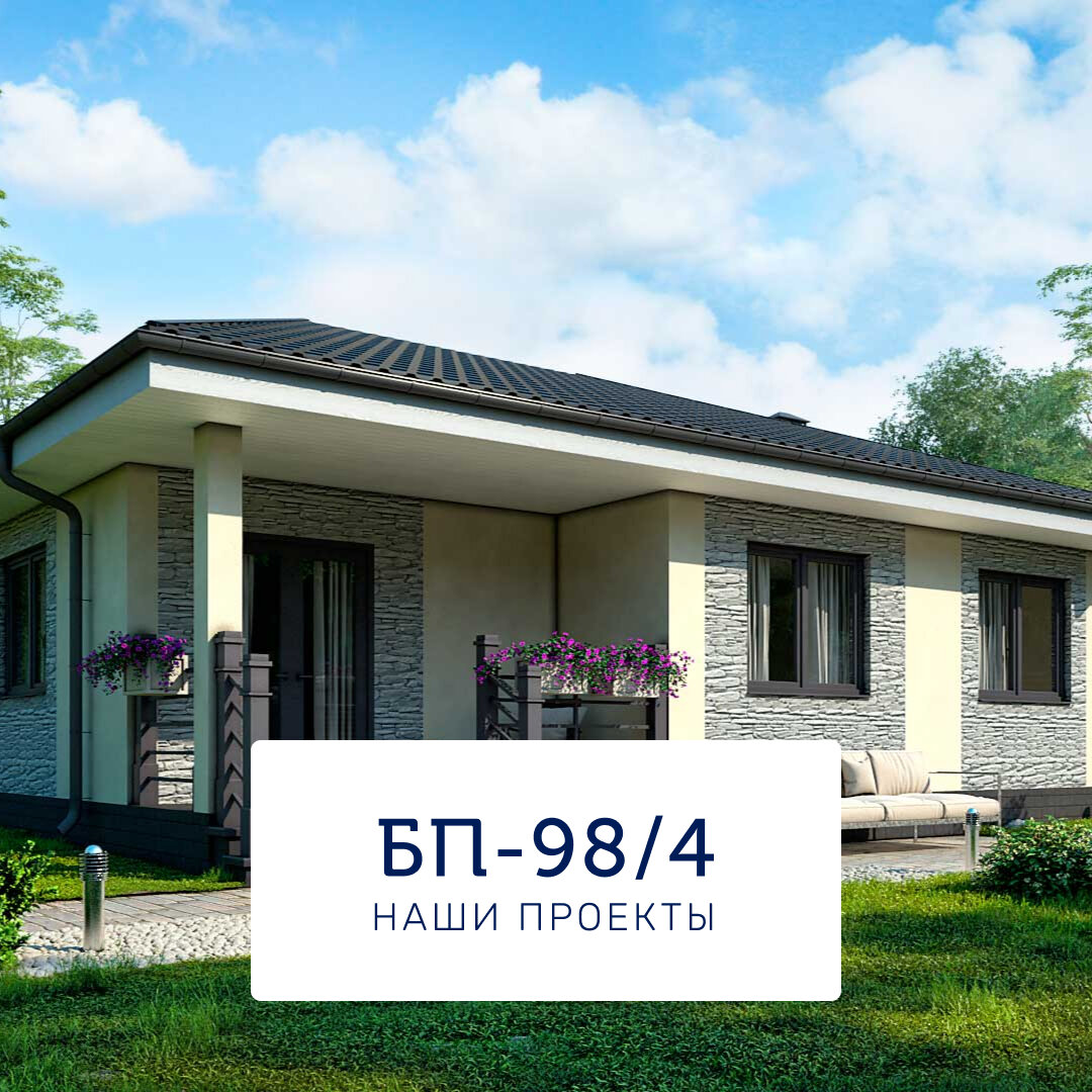 💥 Наши проекты: БП-98/4 💥 Ещё один одноэтажный дом, который подойдёт для небольшой семьи или пожилой пары – дом по проекту БП-98/4. Дом имеет квадратный периметр, его площадь составляет 96,3 кв. метра, а удобство планировки обеспечено зонированием пространства. ✔️ Правая часть дома отведена под зону общего пользования: здесь находится гостиная, совмещённая со столовой и кухней. Из гостиной можно выйти на террасу заднего двора. ✔️ Левая часть дома предназначена для отдыха и состоит из 3 спален. Также здесь находится общий санузел. ✔️ Левая и правая части дома соединены коридором. Входная группа состоит из крыльца и тамбура. Справа от тамбура расположена котельная для размещения газового оборудования. Дом по проекту БП-98/4 доступен к заказу въ одной из комплектаций: ◼️ Базовая; ◼️ Тёплый контур; ◼️ Тёплый контур+; ◼️ с отделкой «White box». Любая из комплектаций может быть собрана с использованием панелей: ◼️ БЭНПАН-Д – двухслойные железобетонные ребристые утеплённые панели под мокрый