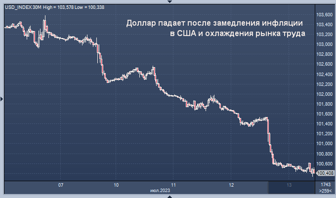 Базовая инфляция в США в июне составила 0,2% против ожиданий рынка в 0,3%. Общий годовой индекс потребительских цен упал до 3% и продолжает снижаться с момента достижения пика в 9,6% годом ранее.