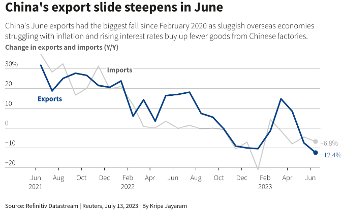 Исходящие поставки из второй по величине экономики мира в июне упали сильнее, чем ожидалось, на 12,4% в годовом исчислении, показали данные Таможенного бюро Китая в четверг, после падения на 7,5% в мае.