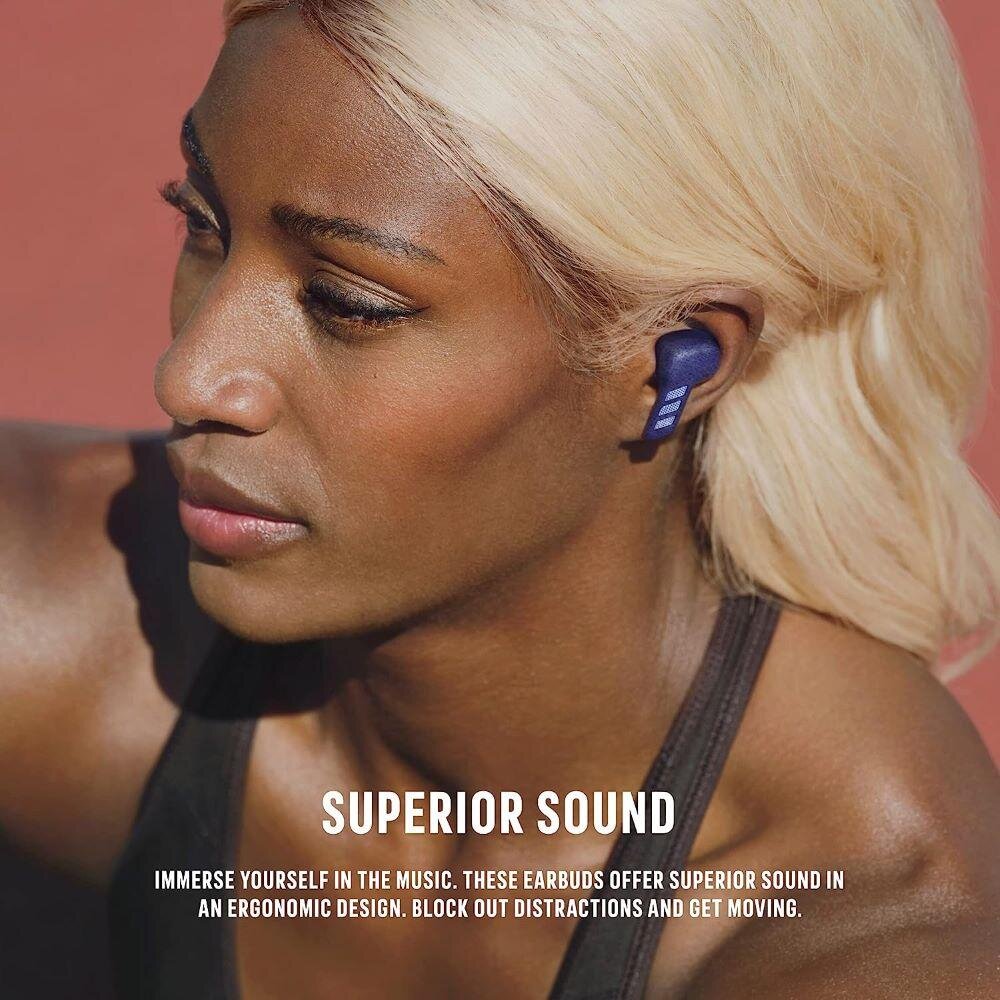 Изначально эта модель стоила 100 долларов, но летом 2023 беспроводные наушники для бега с защитой от воды можно приобрести всего за $44. Skullcandy Push Ultra оснащены крючком, поэтому прочно фиксируются на ушной раковине. В них легко заниматься любым спортом и даже плавать в бассейне. Автономность Skullcandy Push Ultra впечатляет: 41 ч. Имеется интересная особенность — активация наушников голосом через фирменное приложение.