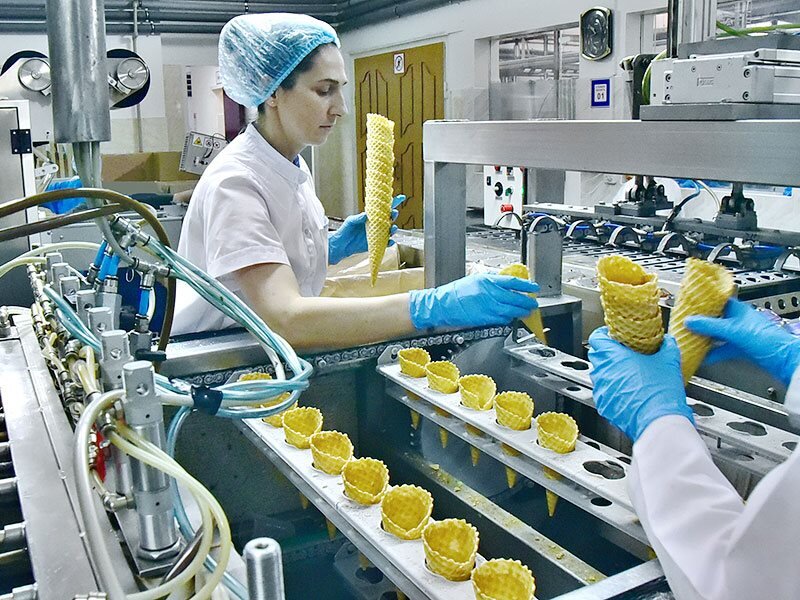 – Оно начинается с качественного сырья. Его, а это молоко, различные наполнители, упаковка, проверяют технологи в нашей лаборатории. Потом сырье "встречается" в варочном цехе, где по советской, современной, европейской, авторской рецептурам варят мороженое и смеси отправляют в хранилище – огромные баки объемом в 4–5 тысяч литров. Там оно созревает от нескольких часов до суток и отправляется на производственные линии. У нас три цеха по выпуску мороженого. В цехах смесь поступает во фризер, потом – на дозаторы, которые выдают запрограммированную емкость. Далее – камера шоковой заморозки на 30–40 минут для закаливания продукта и транспортер с фасовкой. Потом – склад и отгрузка.