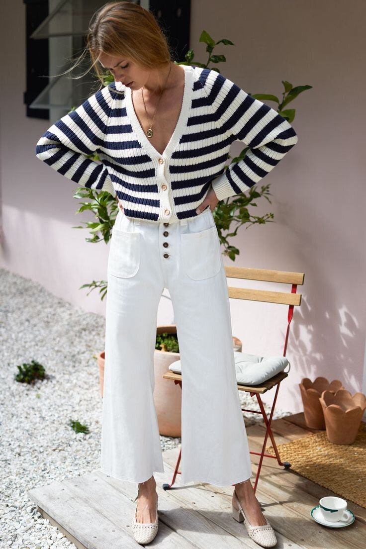 Прежде всего, заправим кардиган внутрь и будем носить его с белыми брюками или джинсами. Здесь в стилистическую игру вступает цвет кардигана. Чем выше будет контраст между брюками и карди, тем ярче и актуальней смотрится наряд. Обувь выбирайте в тон к кардигану. С каблуком или без, решайте сами. Если вы пока не готовы носить карди на голое тело, наденьте внутрь бельевой топ под шелк в тон к брюкам. Украшения здесь добавляем минимально.