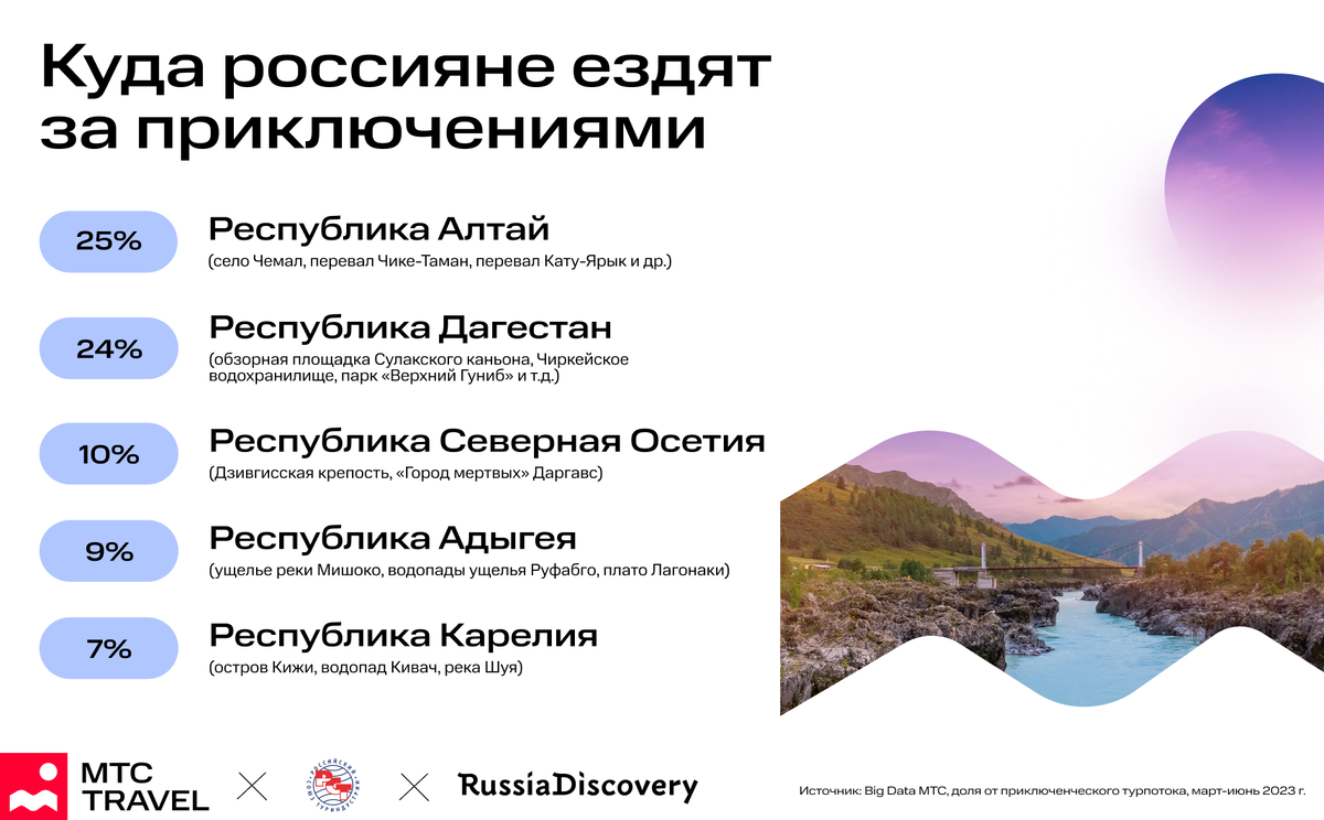 Одним из самым востребованным регионов для приключенческого туризма с марта по июнь 2023 года стала Республика Дагестан – каждое четвертое путешествие состоялось в этом направлении, говорится в совместном исследовании сервиса бронирования отелей МТС Travel, туроператора RussiaDiscovery и Российского Союза туриндустрии.