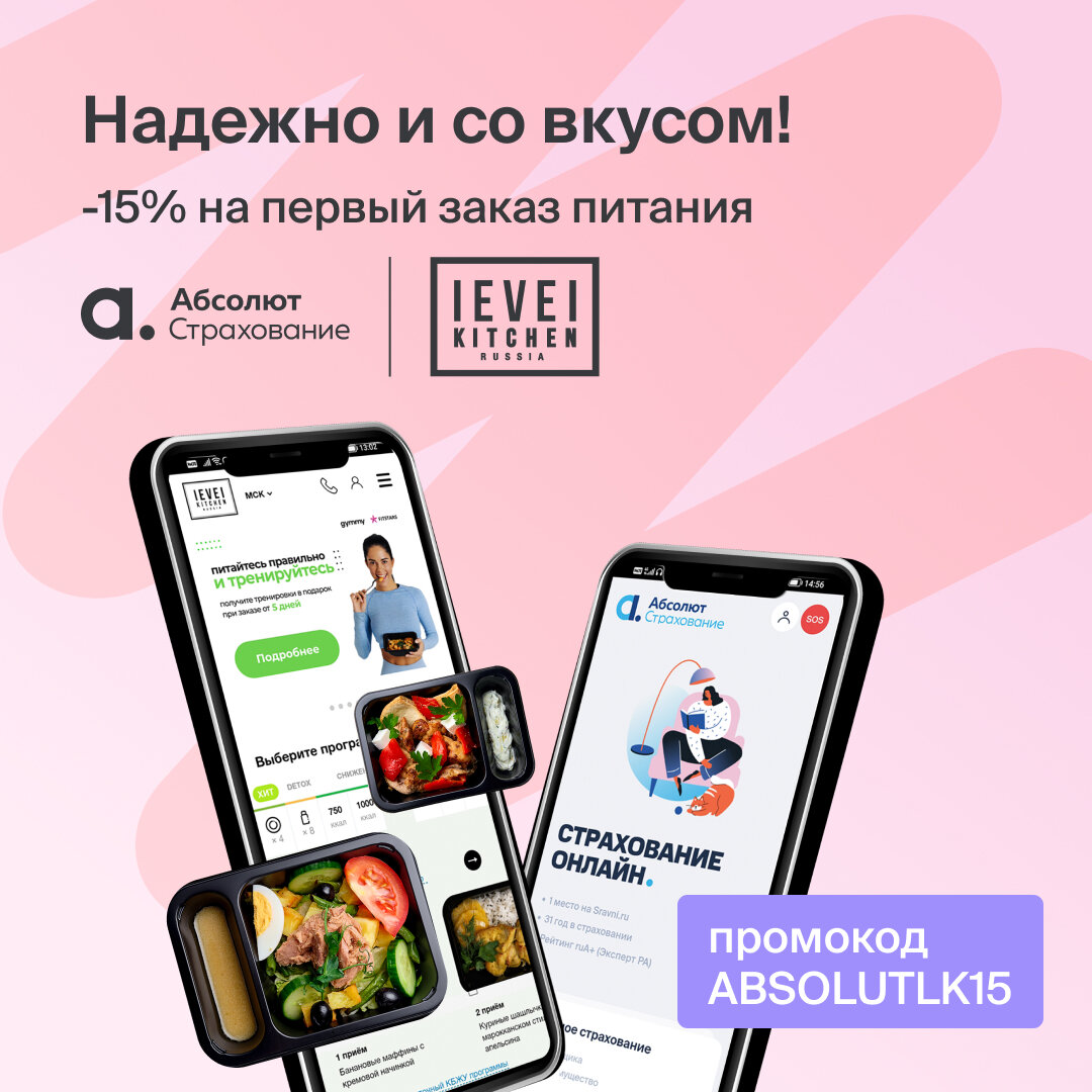 В рамках акции скидка в Level Kitchen будет доступна клиентам «Абсолют Страхование» по промокоду ABSOLUTLK15 на первый заказ* – полезную и вкусную еду на целый день, которую доставит курьер. А по секретному промокоду, который в свою очередь предоставит Level Kitchen после оплаты заказа, клиенты смогут получить 20% скидку** на полисы страхования от несчастного случая, выезжающих за рубеж, путешествующих по России, имущества и от укуса клеща.