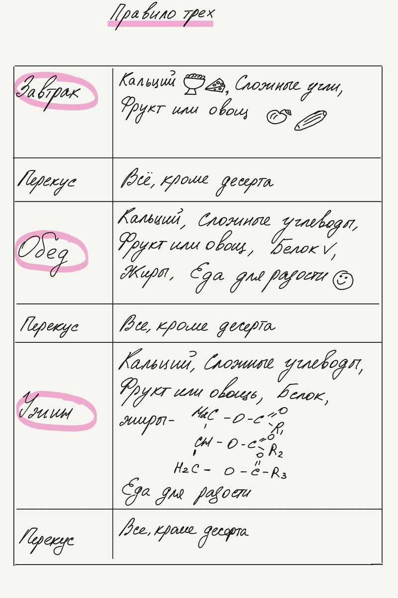 Жить в РПП невозможно. Точнее, возможно существовать, а вот полноценно жить - нет. Жизнь человека с РПП похожа на замкнутый круг, где все мысли крутятся вокруг еды и каждый день начинается с голодовки, а заканчивается перееданиями. Более того, расстройство пищевого поведения является одним из самых смертельных психическим заболеванием. Каждый человек в какой то момент приходит к мысли, что так больше нельзя. Что это не жизнь, а жалкое существование, где каждый день наполнен бесконечными проверками тела, сравнениями с другими людьми и бессмысленными голодовками. Я много изучила за годы в РПП и готова поделиться с вами ниже) Какие есть пути восстановления? 1. "Правило трех" Марши - Херрин. Подходит скорее для начального этапа восстановления, когда нужно иметь хоть какую-то структуру и упорядоченность. План простой - три перекуса и три основных приема пищи. Обязательно углеводы, много углеводов, кальций-содержащие продукты, белки. Ну собственно, весь план ниже. Сделала удобную табл