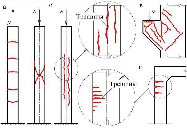 В колоннах проявляются наклонные, вертикальные и горизонтальные трещины. Вертикальные трещины образуются в результате изгиба стержневой арматуры, особенно в тех сечениях, где большой шаг хомутов. Горизонтальные трещины в основном не опасны, однако через них проникает влага, способствующая коррозии арматуры (см. рис. 6.7). В предварительно напряженных элементах трещина на опорных участках вдоль арматуры указывает на нарушение анкеровки арматуры; об этом также говорят и наклонные трещины в приопорныхучастках, пересекающие зону расположения преднапряженной арматуры. Рис. 6.7. Трещины при разрушении железобетонных колонн: а - горизонтальные трещины при разрушении растянутой колонны; б - вертикальные и наклонные трещины при разрушении центрально-сжатой колонны; в - наклонные трещины в короткой консоли колонны; г - горизонтальные трещины при разрушении внецентренно-сжатого элемента Трещины и отслоения бетона могут быть вызваны также коррозионным разрушением арматуры, когда происходит наруше