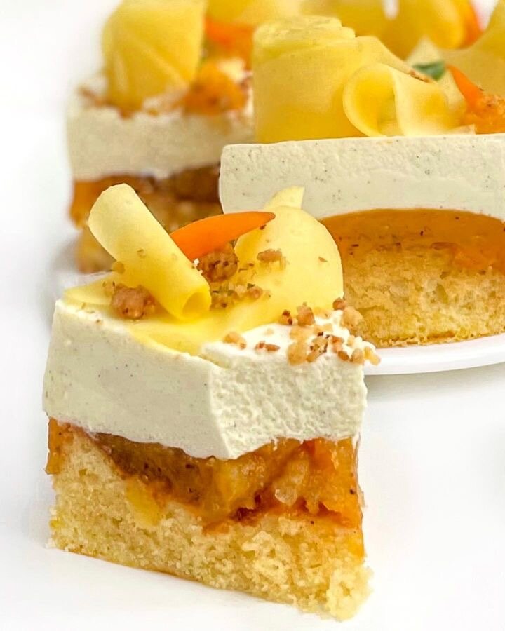 Что может быть вкуснее лимона с манго? Только малина) На просторах интернета увидела эту вкусняшку и не смогла пройти мимо. Я знаю, что вы любите такие десерты) Сохраняйте и обязательно приготовьте 😋 Нарезное пирожное из манго, ванили и лимона. Это лакомство состоит из : - бисквита Мадлен с лимоном, - баварского мусса с ванилью, - конфи из манго, лимона и ванили. Бисквит Мадлен: •25 г растопленного сливочного масла •1 яйцо •60 г сахара •12,5 мл молока •62 г муки •2 г разрыхлителя •32 мл масла •1 щепотка соли1/2 стручка ванили или цедра лимона. Процесс: Взбейте сахар с яйцами. Добавьте молоко и перемешайте. Просейте муку и разрыхлитель для приготовления. Добавьте в массу. Влейте растопленное и теплое сливочное масло. Хорошенько перемешать. Вылейте массу в форму для запекания диаметром 16 см, смазанную маслом. Сверху добавьте измельченные фисташки . Выпекать около 15 минут при 160 градусов. Баварский мусс: •75 г цельного молока •13 г сливок 33% •10 г сахара •22 г яичных же