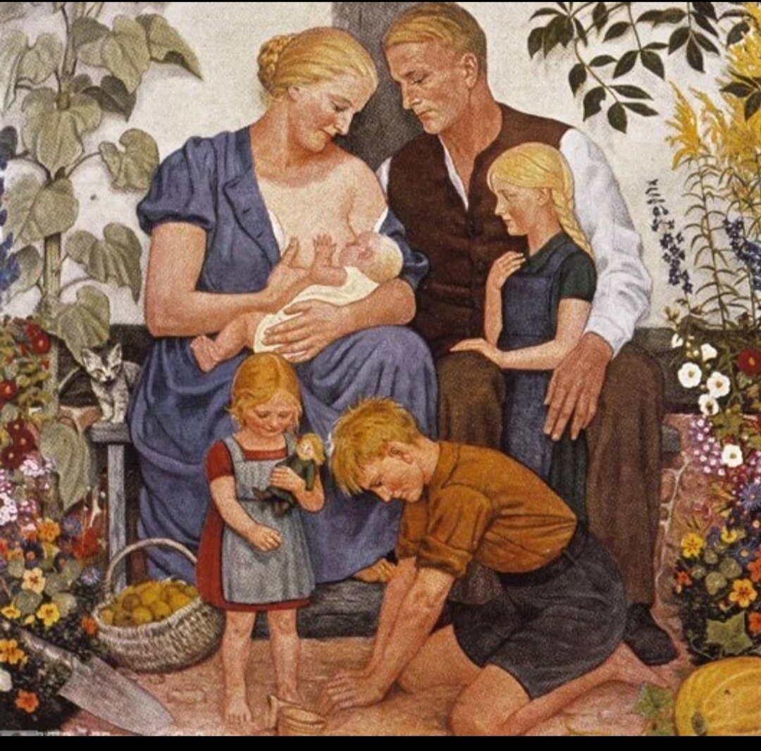 Картина «Семья» Вольфганга Вилльриха кажется вполне безобидной, но многие детали на ней кричат совсем об обратном. Рассказываем, что же такое на самом деле изображено на ней Что поверхностно можно увидеть на картине? При поверхностно взгляде мы видим на картине идеальную семью, которая отдыхает у домика в саду. Сцена практически идеалистична: мать кормит младшего ребенка, отец с любовью смотрит на жену и малыша, при этом обнимая дочь. Старший сын и еще одна дочь вместо занимаются садом. Многое в картине отсылает на сказочность сюжета (костюмы героев, традиционное обустройство дома и цветовая палитра). Идеалистичности картины добавляет и милый котенок, спрятавшийся за спиной матери. Самые внимательные зрители могут разглядеть гнездо, которое помещено в ветвях дерева в правом верхнем углу. Кто ее автор? Автор этой работы Вольфганг Вилльрих (1897-1948) — немецкий «расовый художник» времен Третьего Рейха. В историю он попал как самый главный защитник нацистской художественной политики. С