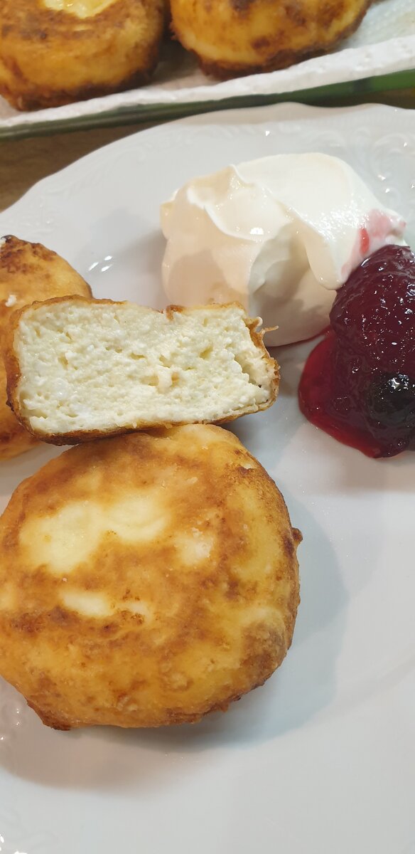 2 яйца 1/2 ч.л. соли 2 ч.л. сахара 1/2 ч.л. ванильного сахара или ванилина на кончике ножа - смешать. Добавить 3 шт. 200 грамовых пачек 9% творога, 1 ст.л сливочного масла (растопить в микроволновке) +1 десерт. ложка 20% сметаны (можно заменить на 2-3 ст.л 20% сливок, смотря что есть в холодильнике). Через сито всыпать 1.5-2 ст.муки. Можно добавлять изюм (горсть белого изюма предварительно промыть, залить кипятком на 5 минут, просушить). Разогреть масло подсолнечное рафинированное на сковороде с толстым дном и высоким бортом (такая в хозяйстве хороша и для оладий). Сырники перед жаркой предварительно обвалять в муке. Готовить на среднем огне 1.5-2 минуты с каждой стороны. Готовые сырники выложить на салфетку, чтобы убрать избытки жира. Общее время приготовления около 30 минут. Хитрости: 1.Секрет сырников в качестве творога: Творог в пачках не должен быть жидковатым или крупинчатым. Масса должна быть плотная, однородная. Так как даже у проверенных производителей консистенция в зав