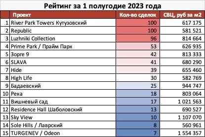Так, больше половины общего объема сделок первого полугодия в премиальном сегменте пришлось на проекты «River Park Towers Кутузовский» (100),