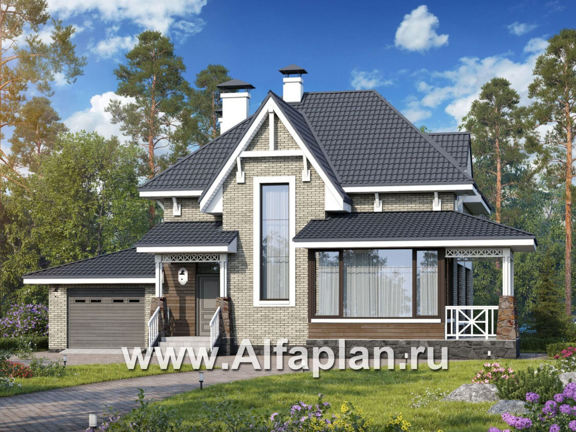 Дом в стиле замка: проект 344В «Медея», 176 м2, 2 этажа, 3 спальни, гараж для 1 авто, терраса