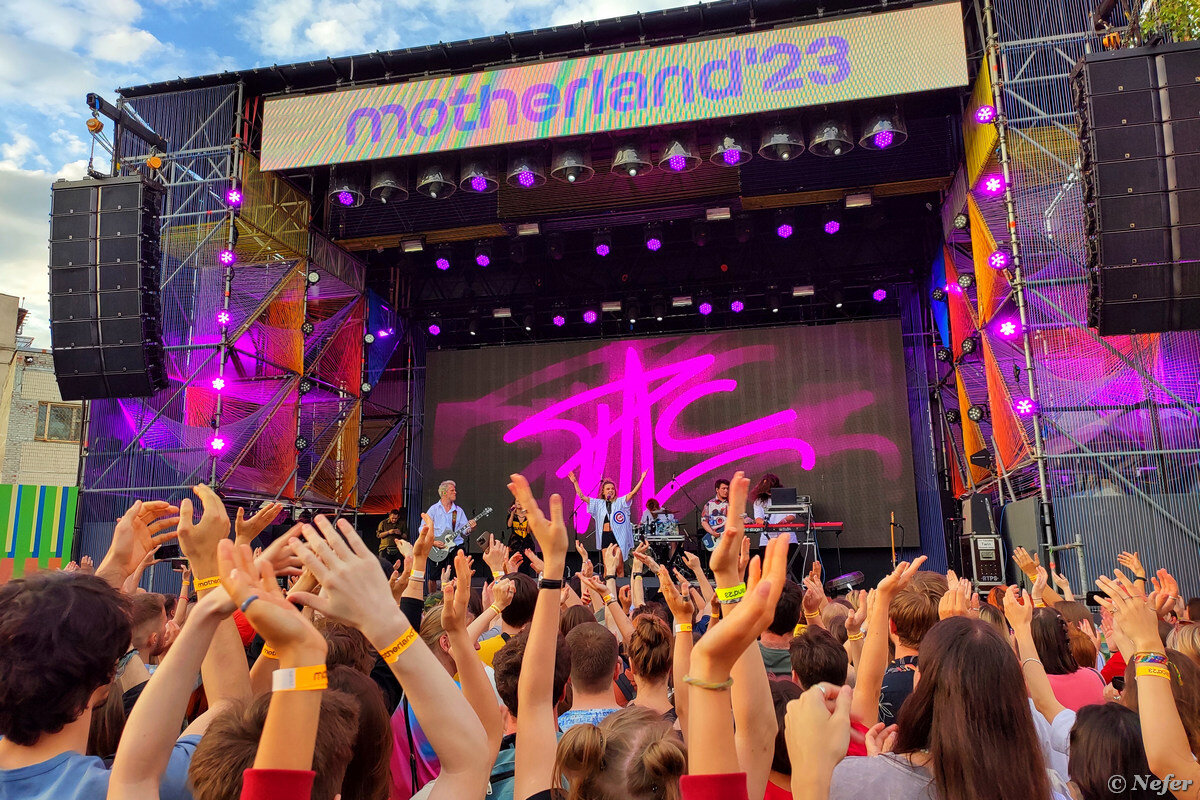 Впервые за долгое время побывала на музыкальном фестивале! Называется Motherland и считается крупнейшим фестивалем независимой музыки. Фестиваль проводится с 2013 года. Был перерыв на пару лет: пандемия, изоляция, ограничения на проведение мероприятий и все такое. Стали поговаривать, мол, все, наверное, больше не будет. Но в этом году фестиваль случился в самом масштабном варианте: четыре сцены, больше 25 исполнителей, расколбас до ночи. На заглавной фотографии группа PALC, она, пожалуй, произвела наибольшее впечатление. Просто огонь. Фестиваль проводился на двух больших площадках: Summer Stage и Mutabor. Две открытые сцены и две закрытые, в смысле под крышей в помещении. Увы, внутри находиться было абсолютно невозможно, очень жарко и невыносимо душно. Заходили послушать буквально на 5-10 минут и шли обратно на воздух. Зато на уличных сценах все было прекрасно. Народу, как видите, много, не давки не было. Можно было пробраться поближе к сцене. Хорошо видно, хорошо слышно. И