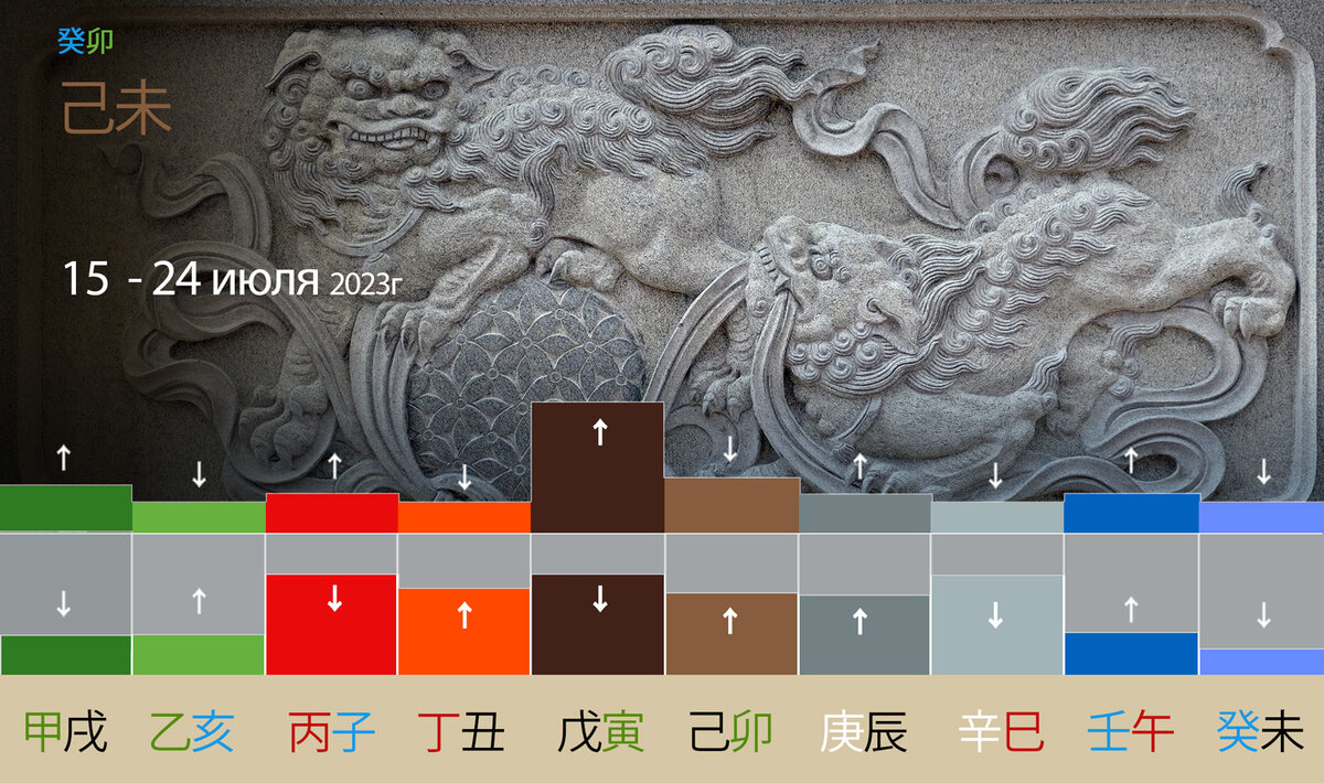 15 июля началась новая декада – вторая в 60-дневном цикле июля-августа. Серединка, центр - это место стихии Почвы. Вторая,средняя декада месяца начинается со значительного усиления этой стихии, с торможения энергии в первом дне декады, где знак Дерева ян 甲 превращается в Почву, сливаясь со знаком месяца 己. Гексаграмма дня поддерживает общую тему - это Непроходимость, 39. Инерция сверхактивного месяца Лошади окончательно гаснет, мы начинаем разбираться с завоеванными трофеями. Захочется заботы, уюта, забить кладовки, залезть под одеялко или все бросить и на дачу, осмотреться, подготовиться, отдохнуть. Управляет этими 10 днями знак Почвы инь 己, который итак присутствует в месяце, поэтому он словно удваивается, выражает себя настойчиво и явно. Знак 己 отвечает за среду, питание и воспитание. Не мудрствуя лукаво, посвятим это время семье, дому, деткам, домашним питомцам, саду, позаботимся о подчиненных, вспомним о родителях, обратим взор на тех, кто терпит лишения и страдает. Мы будем возна