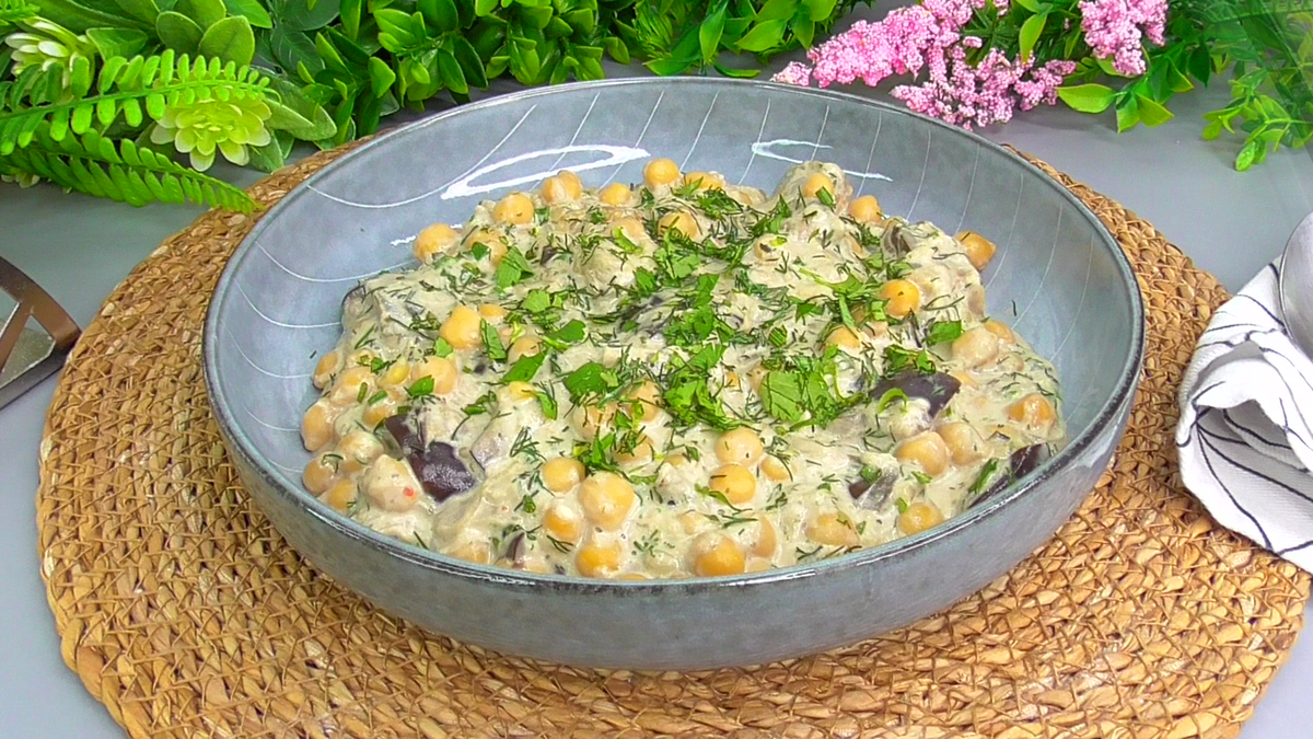 Так баклажаны вы точно еще не готовили! Муж был в восторге! Представляю вашему вниманию очень вкусное блюдо из баклажан и гороха. Это блюдо из турецкой кухни, я его немного изменила вод свой вкус. Оно может служить как закуской, так и полноценным обедом, так как. является сытным и питательным. Это и вправду ну очень вкусно, стоит попробовать! Приготовление ✅ Предварительно нут надо замочить в холодной воде на 4-6 часов, я замачиваю его в ночь. Если не успели замочить заранее, можно залить кипятком на 1-2 часа. ✅ Берем нут (предварительно замоченный на ночь), заливаем водой и отвариваем до готовности 30-40 минут. ✅ Баклажаны нарезаем на крупные кубики, солим и оставляем на 20 минут, чтобы вышла горечь, после промываем и обсушиваем. ✅ Лук нарезаем тонко на полукольца. ✅ В сковороду вливаем растительное масло и добавляем лук. Обжариваем его до золотистого цвета. ✅ Добавляем баклажаны и тушим минут 20 (при необходимости, добавляем немного воды). ✅ Добавляем сливки, соль и специи — по вкусу