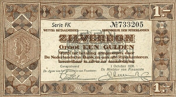 С началом Второй Мировой войны правительство Нидерландов осознало неизбежность военного столкновения с нацистской Германией, а также возможные экономические сложности, связанные с войной. Как в начале Первой Мировой войны, для компенсации нехватки серебряных монет были подготовлены серебряные сертификаты – знаки в 1, 2,5 и 5 гульденов. Они были выполнены довольно просто – с обеих сторон были орнаменты и только на билете в 1 гульден поместили небольшой портрет-барельеф королевы Вильгельмины (на лицевой стороне) и изображение герба (на обороте). Впрочем, эти знаки попали в обращение уже после оккупации Нидерландов. Несмотря на то, что нацисты принудительно ввели на территории страны оккупационные марки, гульден продолжал оставаться валютой Нидерландов. Марки направлялись на покрытие расходов, понесённых Германией в Нидерландах, и обменивались по фиксированному курсу. В обращение они не поступали, так как Банк Нидерландов напрямую обменивал их на гульдены. Это привело к неоправданному ув