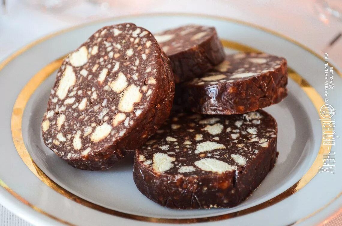 Колбаска из Печенья (Как в детстве) Для пирожного возьмем: печеньки – 600 г., 280 г цельного сгущенного молока, орешки (грецкие или арахис) – 170 г., 190 г сливочного масла, какао – 5-6 ч.л., ванилин. 1.Измельчаем печенье так, чтобы попадались крупные кусочки. 2. Затем доводим до нужного нам размера орехи. Можно сделать это в комбайне или кофемолке. Соединяем их с печеньем. 3. Теперь берем брусок сливочного масла. Желательно достать его заранее, чтобы оно на пару часов дошло до нужной нам консистенции. И это хорошо размягченное сливочное масло нужно выложить в печенье. 4. Теперь пора всыпать какао и ванилин. 5. Смешиваем эти ингредиенты и вливаем сгущенное молоко. Ложкой хорошо вымешиваем тесто, если оно вдруг получилось жидковатым,то разломайте в него еще парочку печенек. 6. На стол выстилаем пищевую пленку, на которую выложим часть теста. 7 Формируем из него колбаску и заворачиваем в целлофан, подворачивая края. Затем убираем пирожное в морозилку на 4 часа. #рецептыотКати