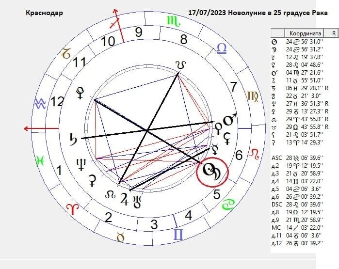 17/07/23,в 21:33мск- 🌑НОВОЛУНИЕ в 24°56'Рака ♈️17/07/23,в 22:47мск-Северный Узел(R)в Овен,Южный-в Весы Из серии #репортаж_наблюдателя_с_земли ♋Рак-стихия воды,кардинальный знак.Народ,Родина,семья, недвижимость,быт,еда,эмоции. Новолуние создаст конфигурацию-большой крест,т.е.оппозицию к Плутону в Козероге(противостояние народа и власть имущих) и квадратура к Узлам на оси Овен-Весы(узлы меняют знак). 🔘Плутон-планета перемен и трансформации.Запустится некий разрушительный процесс,вовлекая людей в негативные,кризисные ситуации. Что-то будет рушиться,что-то видоизменяться,очень важно наблюдать за разворачивающимися событиями,особенно тем людям,у которых в натальной карте присутствуют дисгармоничные аспекты Плутона к светилам и Узлам.Это начало долгосрочных перемен,непрочные браки будут распадаться. Не принимайте участие в спорах,конфликтах,избегайте большого скопления людей,толпа не управляема.Каждый должен определиться в своих ценностях.Также могут быть смерчи в море,стихийные бедствия,