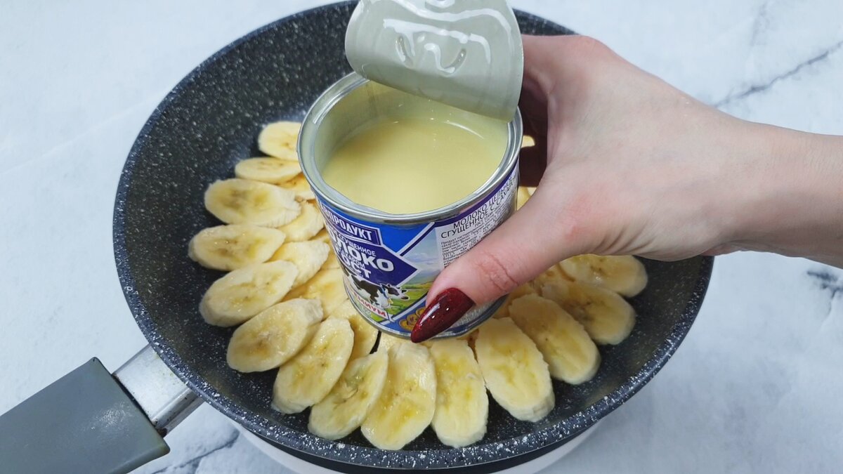 Как готовить: Два банана очищаем от кожуры. И нарезаем на кружочки. В сковороде растапливаем 30 граммов сливочного масла, вливаем 50 граммов сгущенки и перемешиваем. Готовим на маленьком огне 3 минуты. На дно сковороды выкладываем кружочки бананов. В миску разбиваем одно куриное яйцо. Вливаем 200 граммов сгущенки. Всыпаем пакетик ванилина и взбиваем венчиком. Вливаем 100 мл молока и перемешиваем. Просеиваем 160 граммов муки и 10 граммов разрыхлителя. Перемешиваем тесто до исчезновения комочков. Заливаем тестом бананы в сковороде и распределяем лопаточкой, чтобы тесто равномерно покрыло бананы. Накрываем сковороду крышкой и готовим пирог на маленьком огне 20 минут, пока верх пирога не перестанет быть липким. Затем накрываем бумагой для выпечки и с помощью крышки переворачиваем пирог на другую сторону. Укладываем вместе с бумагой в сковороду. Накрываем крышкой и готовим на маленьком огне еще 5 минут. Готовый пирог выкладываем на блюдо и посыпаем сахарной пудрой. Нарезаем на порции. По ж