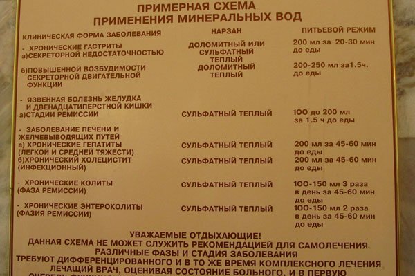 Мне по показаниям из Нарзанов назначены были сульфатный или общий. Сразу скажу, что сульфатный Нарзан имеет специфический вкус, для меня очень не приятный, и запах сероводорода, схожий с запахом тухлых яиц. Вообщем, пить я его не смогла. Зато с удовольствием пила общий Нарзан. Вкус у него вполне приятный, посторонних запахов нет. Пить его легко, жаль, что его не подогревают — люблю теплую минералку.