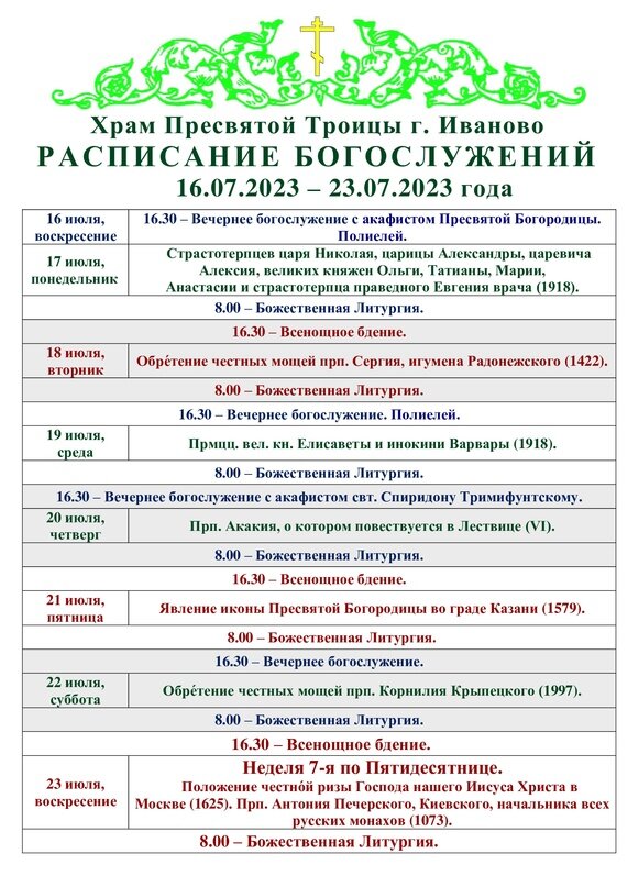 16-23.07. Расписание богослужений в Троицком храме города Иваново