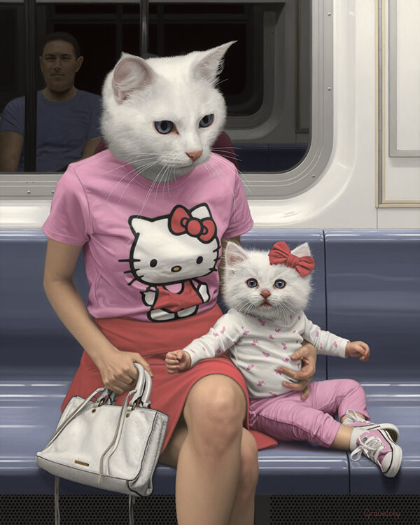 Те из нас, которые (как и я) пользуются общественным транспортом не раз и не два ловили себя на мысленном сравнении попутчиков с ... (скажем так аналогиями первого порядка). Смотришь на человека и явно приходит в голову: лиса лисой или кот масляный. Мэтью Грабельски (Matthew Grabelsky) развил эту идею и прямо таки визуализировал на пассажирах нью-йорксого метро. Художник рисует (подчёркиваю, рисует) сюрреалистические портреты людей, которые кажутся нормальными от шеи и ниже, но у которых головы заменены головами животных, как диких, так и одомашненных. Сам автор, родившейся в лос-Анжелесе, но выросший в Нью-Йорке в самом начале не мог определиться с судьбой. В 2002 году он одновременно получает степени бакалавра астрофизики и искусства и истории искусства в университете Райса (Хьюстон, Техас, США). Причём выставлять свои работы Мэтью начал именно в университете и занимается выставочной деятельностью весьма и весьма активно. А с 2011 года его заметили журналисты и известность художни