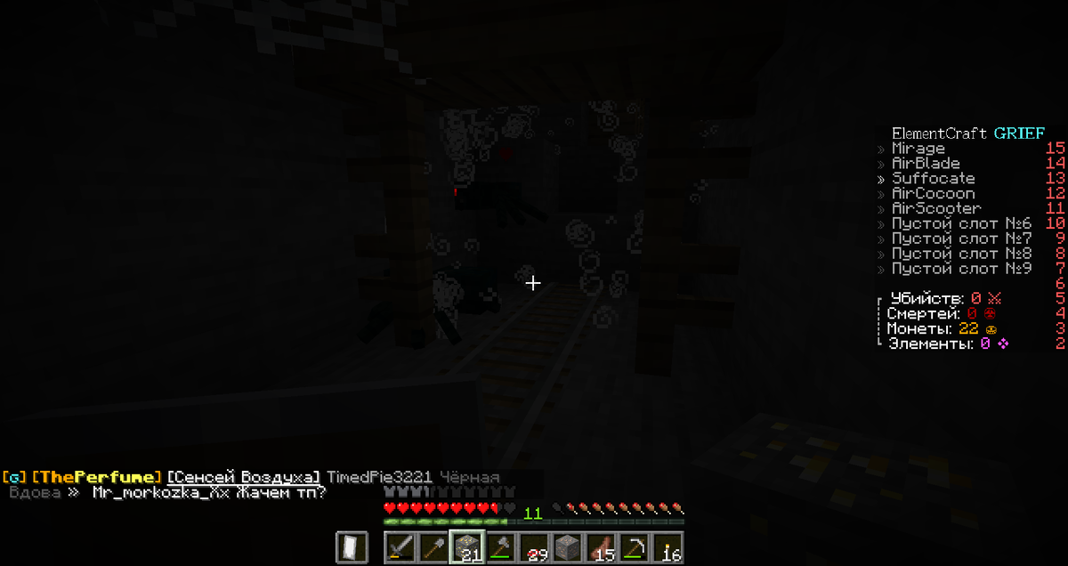 Это будет первое за долгое время выживание на сием канале. И будет оно о моей игре на сервере со стихиями, а именно на ElementCraft. Зайдя на сервер мне предоставили выбор между четырьмя стихиями (на самом деле были и другие, но получить их можно только за донат): огонь, вода, земля и воздух. Мне больше по душе была воздушная стихия, её я и выбрал. Далее предстояло выбрать 10 способностей для моей стихии. Я выбрал только 5, потому что не до конца понимал, как это работает и хотел опробовать. Мои способности на данный момент: Дальше я думаю, выберу ещё, но пока так. Помимо этих способностей я кстати заметил, что не получаю урона от падения и во время бега у меня появляются эффекты скорости и прыгучести. Ну и еще можно выделить 5 целей на этот выпуск: После настройки способностей я побежал исследовать мир и искать место для дома. Но место должно быть не абы какое, я ведь всё-таки маг воздуха. Мне нужен дом высоко в горах, где я смогу прятаться от злых гриферов медитировать смотря на уп