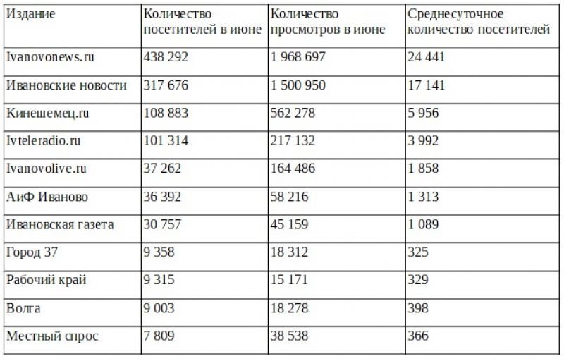 Ассоциация новостных сайтов составляет рейтинги электронных СМИ в регионах-партнерах. Подготовлен рейтинг ивановских электронных СМИ за июнь 2023 года. Для составления рейтинга используются данные ведущего сервиса интернет статистики liveinternet.ru, предоставляющего наиболее понятные и разнообразные инструменты сбора, обработки и последующего анализа данных. Но данный счетчик открыт не у всех СМИ, поэтому в рейтинг включены только те СМИ, чьи данные по счетчику имеется возможность проверить. Добавим, что места в рейтинге распределялись по количеству посетителей за месяц. По сравнению с рейтингом за май, в июне расстановка мест изменилась незначительно. Сайт «Ивановской газеты» потерял две позиции, издание «Город 37» прибавило две позиции. Сетевое издание «Ивановские новости», являющееся членом Ассоциации, предоставило данные по самым читаемым материалам. В июне читателей все еще интересовали новости о престарелой женщине, которая жила в ужасных условиях. Также много просмотров набрали
