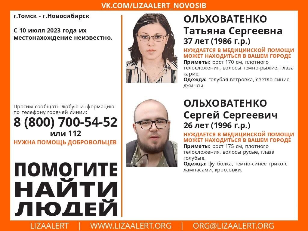 С 10 июля в Новосибирске волонтёры пытаются найти нуждающихся в медпомощи мужчину и женщину. Волонтёры поискового отряда «ЛизаАлерт» с 10 июля ищут нуждающихся в медпомощи мужчину и женщину. «На горячую линию отряда поступила заявка о пропаже мужчины и женщины. Они пропали 10 июля 2023 года, вышли из дома и не вернулись. Начат информационный поиск, идёт активное распространение ориентировки в сети», — сообщила старший направления пресс-службы ДПСО «ЛизаАлерт» Ольга Бобкова. Согласно ориентировке, 37-летняя Татьяна и 26-летний Сергей Ольховатенко пропали из города Томск 10 июля. Они могут находиться в Новосибирске. Женщина была одета в голубую ветровку и светло-синие джинсы, а мужчина — в футболку, тёмно-синее трико с лампасами и кроссовки. Татьяна плотного телосложения, рост — 170 сантиметров. У неё тёмно-рыжие волосы и карие глаза. Телосложение у Сергея также плотное, рост — 175 сантиметров, русые волосы и голубые глаза. В пресс-службе отмечают, что пропавшие могут нуждаться в медицин