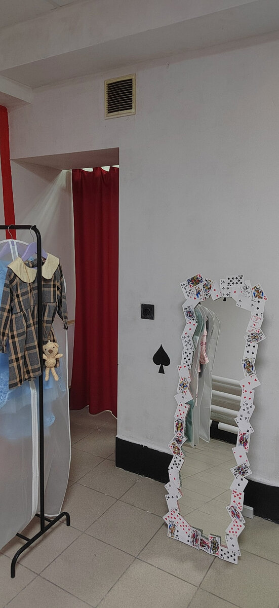 Всем добрый вечер! Наконец-то я подошла к почти-финалу открытия моей костюмерной-проката, отмыла с подругой полы, подклеила свет и задизайнерила зеркало и еще одну стену! Поэтому решила поделиться этим добром с вами. Вот такое вот карточное зеркало.:) Само помещение в тематике карточного цирка, довольно яркое, мне соответствует! Не уверена, что серьезные люди заходят прийти в мою костюмерную, но вот для детей в самый раз! Потому "Пересмешник" в быту и стал именоваться "Клоунарием". Такое вот освещение в клоунарии, наклеили мы с другом диодную ленту до середины потолка, дальше ее не хватило.:) Потом куплю еще гримерное зеркало с подсветкой - и получится совсем красиво. А сейчас предупреждаю! Скример из моего лица на фоне этого безобразия, а то в прошлом посте кто-то испугался и просил предупреждать.:) Еще сделала декор из "воткнувшихся" в стену карт из скотча двустороннего и фантазии. Потом еще немного доделаю, хочу что-то... экстраординарное. И в планах покрасить табуреты, которые мы н