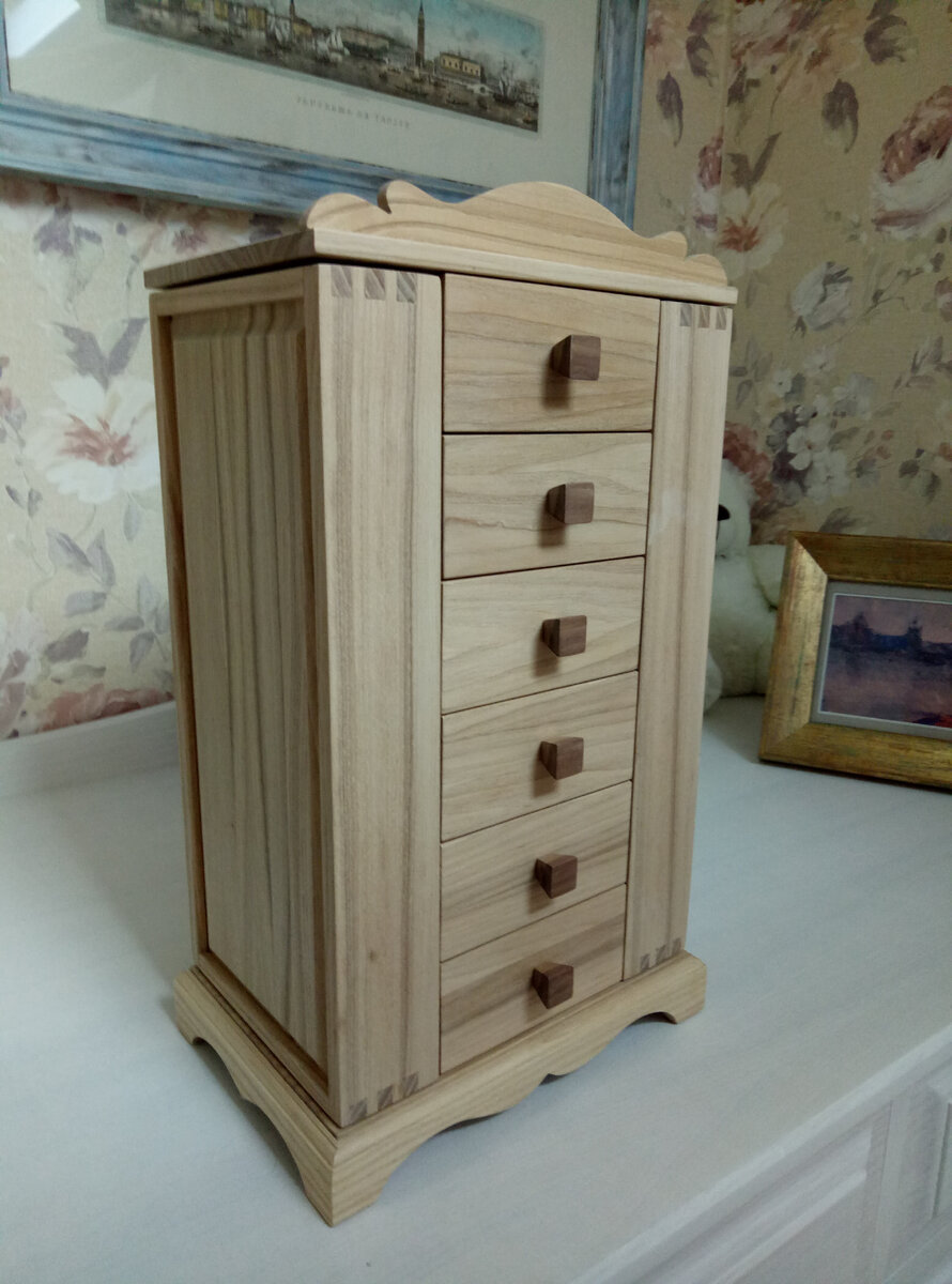 Абсолютно необходимая для любой женщины вещь. Идею подсмотрел у кого-то из заокеанских столяров. Материал: ясень. Соединения выполнены на шипах. Ручки выточены из американского ореха. Боковые створки поворачиваются на штифтах. В закрытом положении фиксируются с помощью неодимовых магнитов,которые я вклеил в донышко и створки. Направляющие деревянные, смазал воском, ящички выдвигаются без усилий.