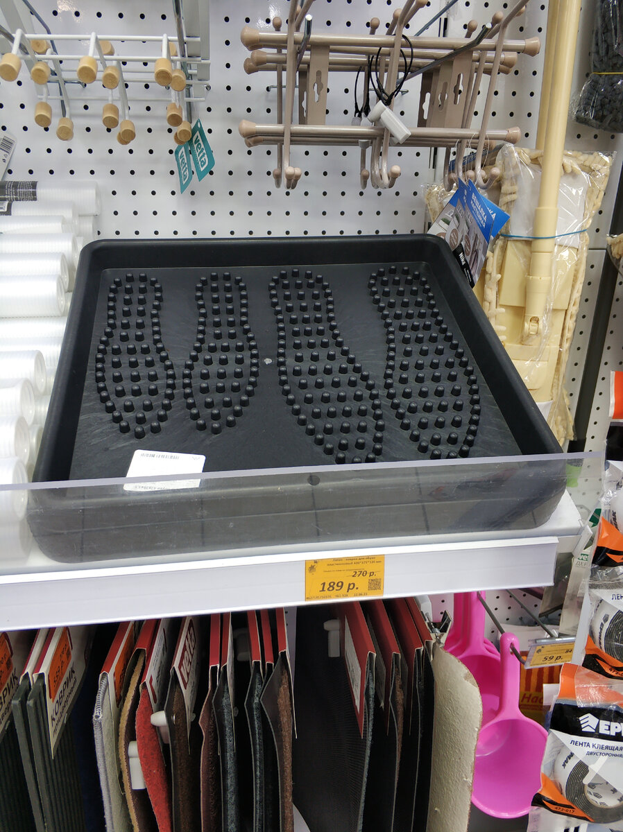 Приветствую, уважаемые! Давненько не делала обзоры из Галамарт. Но я все равно заглядывала туда частенько. просто нечего было такого показывать. Новинок стоящих не видела. Вот в этот раз появились стоящие классные! И даже те, которые давно жду в Фикс Прайс, покупала там, но не возят больше, хотя хочется. Для кухни и дома покажу. А начну с домашних товаров. Вот эти лотки-коврики очень нужная вещь дома в сляготную погоду, особенно, когда снег начинается. Чтоб стекало туда, а не на пол, у меня есть такой коврик. Советую всем, если у вас нет, и если учесть, что сейчас скидка и стоит всего 189 руб. Это реально дешево: Этикетку покажу поближе, материал - пластмасса, тут же и размеры: и ценник поближе: В отделе для кухни и сантехники есть вот такие смесители прикольные, с гибким шлангом. Не знаю, насколько они долговечны, но выглядят очень стильно и удобно! И не надо отдельно распылитесь покупать, правда? У кого есть такой, подскажите, насколько долго служит такой шлагновый вариант? А то п