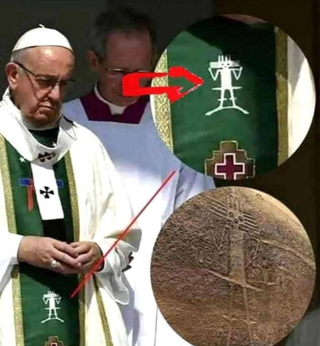 Что общего у света с тьмою? Какое согласие между Христом и Велиаром? (2Кор.6:14-15) На епитрахили главы католической церкви папы Франциска, изображен очень интересный персонаж. Называется это - Гигант пустыни Атакама. Или Гигант Тарапака. Это самый большой антропоморфный геоглиф в мире. Он располагается на географических координатах — 19°56'56.81"Ю широты и 69°38'2.21" З долготы в пустыне Атакама в Чили на одинокой горе Сьерро Уника. Длина изображенной фигуры составляет 86 метров. Гиганта можно увидеть, как максимум, на высоте 6,22 км. По мнению ученых, великан изображает языческое божество, которому поклонялись местные жители. Возраст геоглифа оценивается по разному. Вики пишет о 3000 тыс. лет. По другим данным, Гиганту Тарапака 9000 лет. Он — Какое — либо неизвестное существо. На его голове корона, или же лучи солнца, огромные стопы, а на ногах сапоги, а рука переходит в наконечник стрелы. Чуть выше, располагаются круги, и разные линии. Сами круги создают, как бы, путь из се