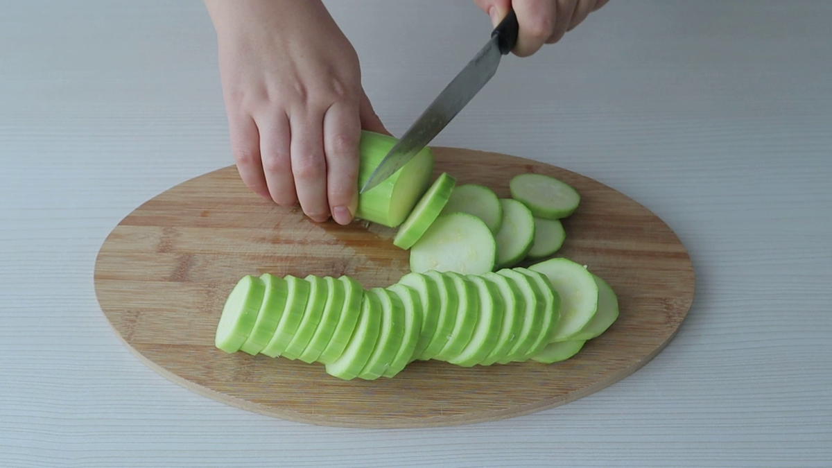 Хорошо промываю кабачки и просушиваю от влаги. Нарезаю кабачки тонкими кружочками (можно нарезать тонкими пластинами - зимой я готовлю фаршированные рулетики и подаю на новогодний стол).