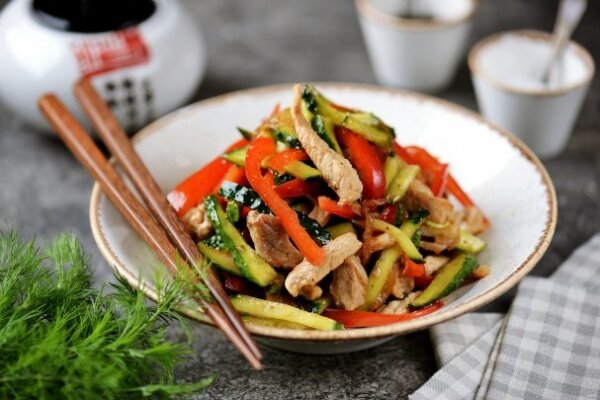 Корейская / Азиатская Ингредиенты рецепта: Количество порций: 2 Как приготовить “Салат "Чим-чим" с мясом” Подготовьте ингредиенты. Помойте и обсушите мясо с овощами. Для этого салата можно использовать как свинину, так и говядину. Первым делом нужно обрезать кончики на огурцах, нарезать их соломкой, сложить в глубокую миску, п