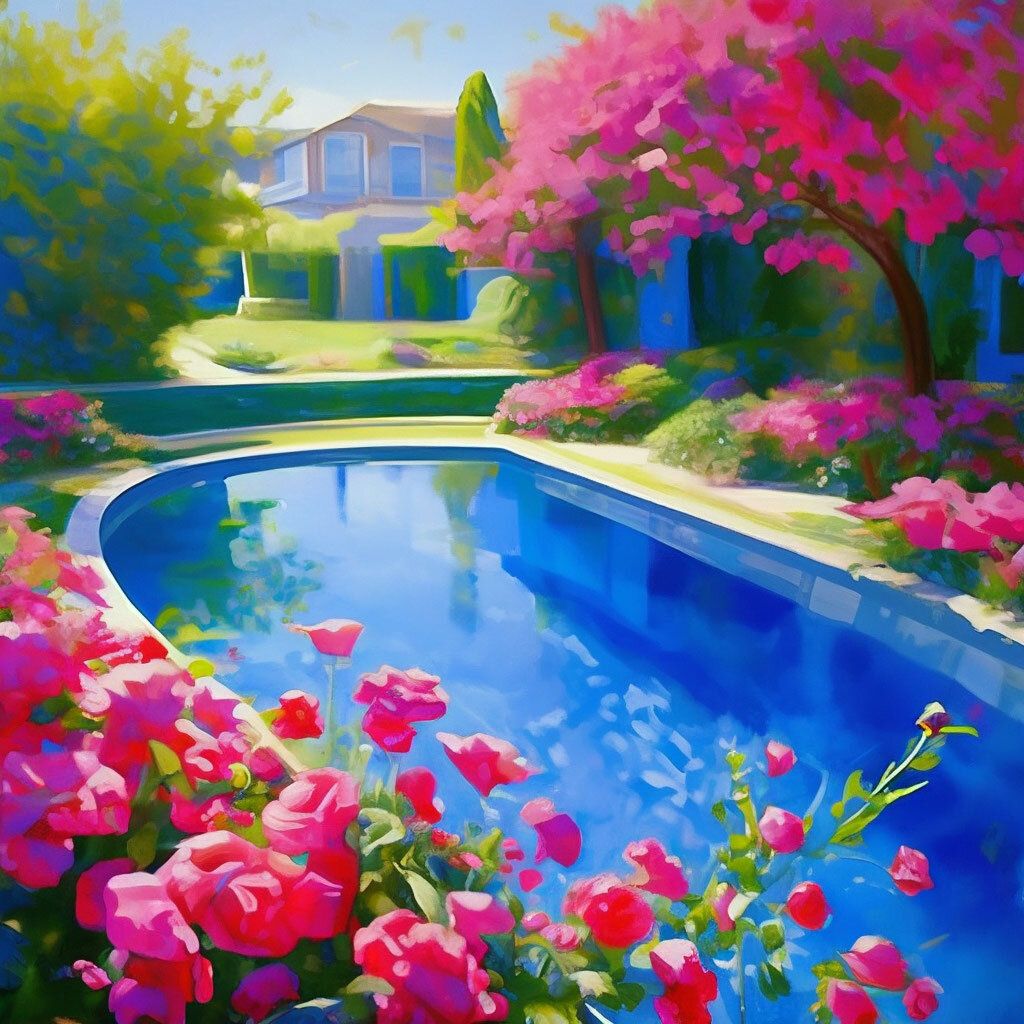 Вот синий бассейн, Вот розово-красный, Зелёно-пурпурный И в крапинках он. На солнышке млею, Как это прекрасно, Цветочно-лазурно Солнечным днём. Автор Антон Власов.
