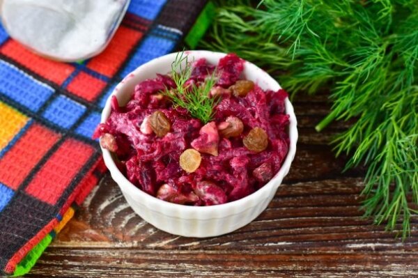 Салаты Ингредиенты рецепта: Количество порций: 1 Как приготовить “Салат со свеклой "Королевский"” Подготовьте ингредиенты. Натрите вареную или запеченную свеклу на терке. Добавьте изюм и грецкие орешки. Заправьте салат майонезом или сметаной. "Королевский" салат со свеклой готов! Приятного аппетита! Больше рецептов можно найти на сайте.