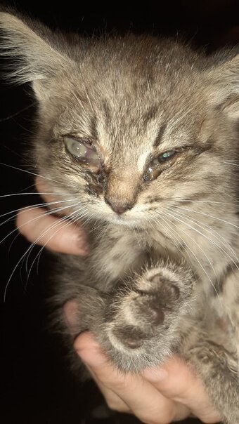 Вчера вот такой котенок был подброшен в коробке в подъезд дома. А потом увидела пост в гр. "Дружок" о НАЙДЕНЫШЕ! С пятой попытки мне удалось связаться с автором поста, которая призналась, что малыша отнесла в подъезд, не планировала везти в Новгород, как написала. Что просто не знала, что делать с таким больным котёнком и куда его девать? И вот так просто решила проблему и спокойно отправилась домой. Я была в полной потерянности. Как котёнку помочь? Куда определить? Мы переполнены. Просить людей о Передержке уже устала, это снова в пустоту. А малыш слабый, истощенный, глазки больные, уже и встать был не в состоянии. В общем котенок уже не в подъезде, забран, у нас под присмотром. А я уже переживаю, хватит ли у нас сил на очередного больного бедолагу? Хватит ли у нас корма на всех наших спасенных бездомышей? Не "перегорим" ли? Если кто - то из сердобольных людей все - таки надумает забрать котёнка, будем очень признательны. Будем благодарны и любой помощи для спасенных бездомышей. На п