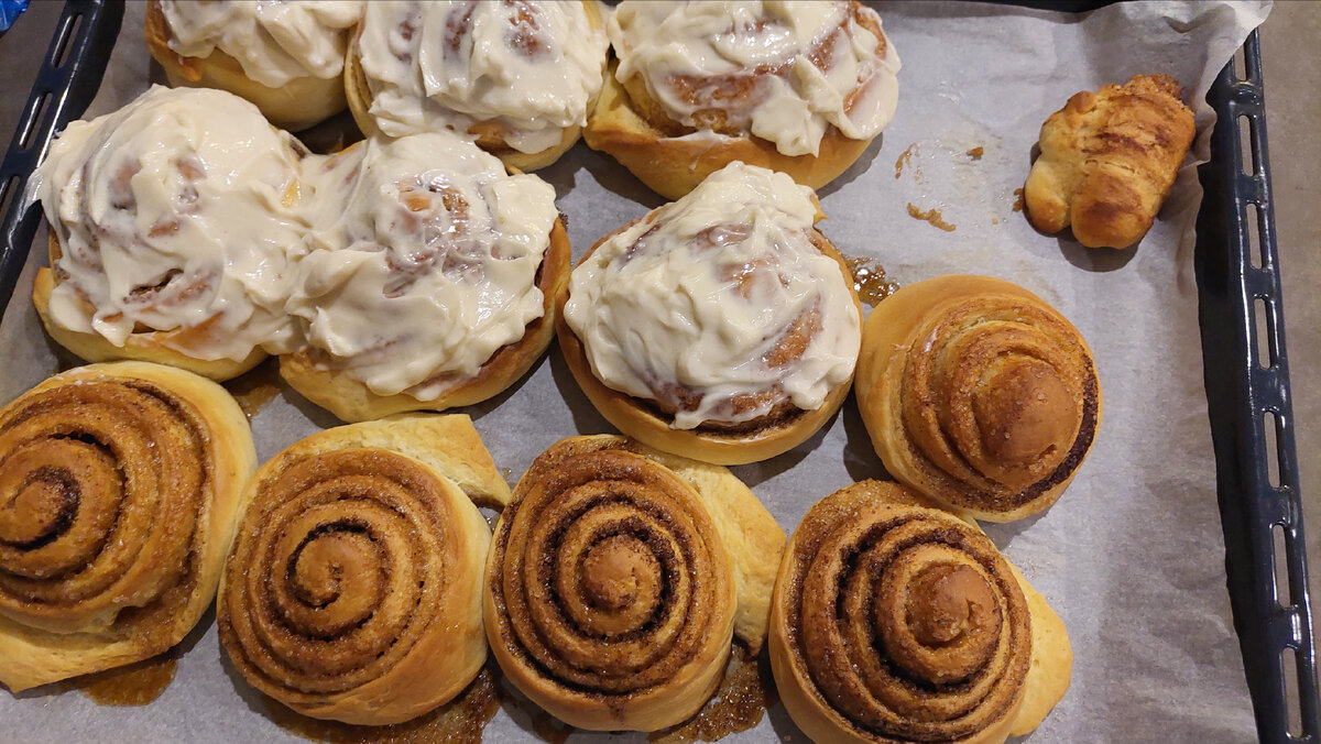 Как и обещала, рецепт ароматных и нежных булочек Ингредиенты : Для теста • Мука 550гр • Сухие дрожжи 8гр • Яйца 2шт (комнатной температуры) • Молоко 250мл • Сливочное масло 160гр • Соль 5гр • Сахар 2ч.л. • Сахар 140гр • Оливковое масло для смазки Для начинки • Тростниковый сахар 200гр • Корица 25гр • Молотый имбирь 1ст.л. (по желанию) • Сливочный сыр 125гр ( рикотта или крем-чиз) (крем у меня получился не на все булочки) • Сахарная пудра 100гр • Ликер 2ст.л. Способ приготовления : 1. Подготовим опару для теста : в ТЕПЛОЕ молоко добавляем сахар и дрожжи. Оставляем на 10мин подходить. 2. В большой миске просеиваем муку, делаем по центру углубление и добавляем растопленное сливочное масло (половину 80гр) соль, сахар (140гр), опару и яйца комнатной температуры. 3. Ставим чашу в планетарный миксер и перемешиваем в течение 5 мин. Если нету миксера, можно лопаткой. Тесто получается достаточно липкое. 4. Перекладываем тесто на доску, припыленную мукой и вымешиваем тесто вручную 5мин. Есл