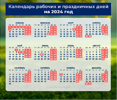 Январь: Подготовка к празднованию Нового Года 2024 будет спокойной и размеренной — последние два дня 2023 выпадают на субботу и воскресенье. После боя курантов нас ждет маленький отпуск. Главные зимние каникулы закончатся 8 января. В сумме с учетом последних декабрьских выходных мы расстанемся с коллегами на 10 дней. Февраль: Тех, у кого предусмотрена пятидневная рабочая неделя, в этом месяце ждут три выходных дня — День защитника Отечества (23 февраля) и следующие за ним суббота и воскресенье (24 и 25 ф