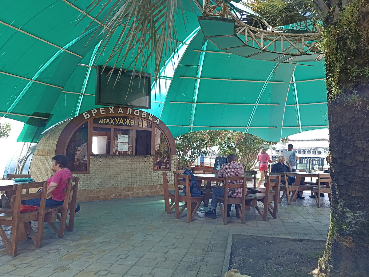Всем доброго дня! Брехаловка- главное Сухумское место встречи. А почему Брехаловка? Здесь собираются люди, обсуждают новости, заказывают кофе. Мужчины любят поговорить о политике, сыграть партию- другую в нарды, домино. Здесь можно встретить всех известных людей Абхазии, за чашечкой кофе решаются главные государственные дела. Интересное место отдыха, душевное. Под зеленым навесом находится несколько столов с лавочками или стульями. Мы купили мороженое и кофе. В меню есть еще эклеры и хачапур. Мы тоже присели немного отдохнуть перед дальней поездкой в Ткуарчал, а затем в Гагру. Брехаловка находится на набережной Махаджиров. На набережной очень красивые места. На театральной площади находится фонтан и достопримечательность Сухума Драматический театр имени С.Чанба. Шикарные пальмы и растительность. Мы в первый раз приехали в Сухум, а Абхазию посетили дважды. Кто в этой стране побывал хотя бы раз, захочет приехать снова.