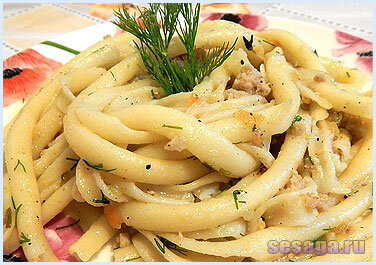 Здравствуйте, уважаемые читатели блога sesaga Существует огромное разнообразие блюд, в которых макаронные изделия используются в качестве гарнира или как самостоятельные блюда, например, пасты, супы, всевозможные запеканки, салаты и т.д. В этой статье я поделюсь нашим домашним рецептом и расскажу Вам, как готовят макароны по-флотски с фаршем в моей семье. Нам понадобится стебель сельдерея, две луковицы, одна морковь, четыре дольки чеснока, 500 гр. фарша, состоящего из свинины и говядины, 500 граммовая пачка макарон в виде полых трубочек, масло, несколько веточек свежего укропа, специи. Мелко нарезаем сельдерей, лук шинкуем полукольцами, а морковь натираем на крупной терке. В сковороду наливаем растительное масло, чтобы оно покрыло дно, выкладываем фарш и, помешивая, обжариваем его 3 – 4 минуты. Одновременно с приготовлением фарша на плиту ставим кастрюлю с водой для варки макарон. Перед закипанием воду не забываем посолить. В фарш кладем морковь и продолжаем жарить. Как только морковка