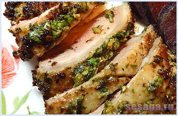 Если Вы приобрели филе с косточками, то вначале отделим мясо от кости. Затем грудки хорошо промываем и на кожице делаем 6-8 поперечных надрезов, чтобы в процессе жарки вытапливался подкожный жир и при этом сама кожа не съеживалась. Чтобы грудки получились мягкими, сочными и ароматными перед жаркой их кладут в маринад, который будем готовить из следующих продуктов: 1. петрушка, укроп, кинза, листья сельдерея – все по половине пучка;