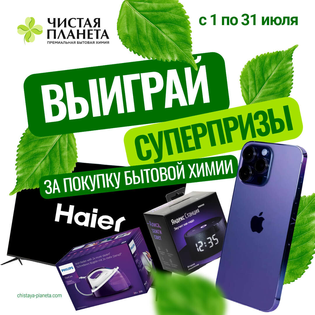 Поддержи всемирный челендж – выиграй IPhone 14, 32-дюймовый телевизор, парогенератор или другие ценные призы от «Чистой Планеты»! Акция #plasticfreejuly проводится уже 12–й год подряд и вдохновила миллионы участников во всех уголках мира! Задача проста — на месяц отказаться от пакетов и упаковки, чтобы минимизировать пластиковое загрязнение планеты! Мы знаем, что отказаться от пластика совсем – это почти невозможно в современных реалиях, однако мы точно знаем, что возможно – дать пластику вторую жизнь! REUSE - это повторное использование, которое не менее важно, чем уменьшение производства пластика или его переработка. REUSE - это то, что когда-то мы умели делать в совершенстве, но забыли. Поэтому мы в «Чистой Планете» уже 4-й год подряд напоминаем соотечественникам о таком маленьком в рамках человека, но существенном в рамках Планеты шаге – покупке бытовой химии и средств гигиены в свою тару! А чтобы повысить мотивацию, каждый из наших покупателей, совершивший с 1 по 31 июля покупку н