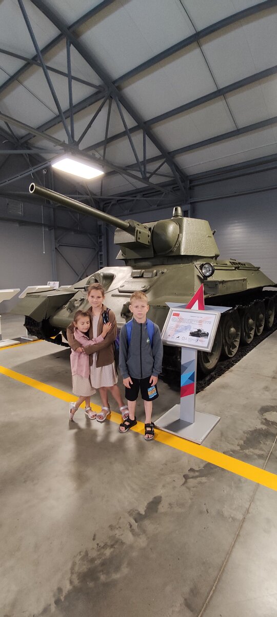 Утром мы на автобусе поехали в парк, на первой остановке решили сходить в танковый музей. Это была первая ошибка, сначала нужно было ехать до храма. В итоге мы заплатили за музей, плюс купили комплексный билет на музейную площадку номер 1 и в партизанскую деревню. Как многодетным у нас вышло 950 р на троих, Саша бесплатно (до семи лет).